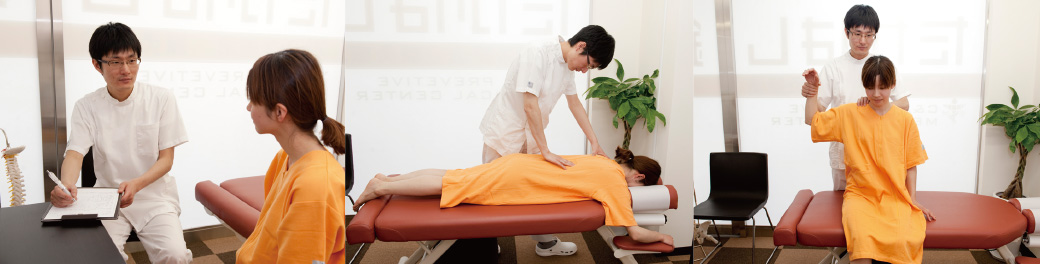 模型やホワイトボードでの説明に加えて、デジカメで撮影した背骨の写真をパソコンのモニターで確認するなど、耳だけでなく視覚的にも分かりやすい方法で現在の体の状態を説明します。その後、それぞれの患者様に合った治療法を提案し、納得されたら治療を開始します。